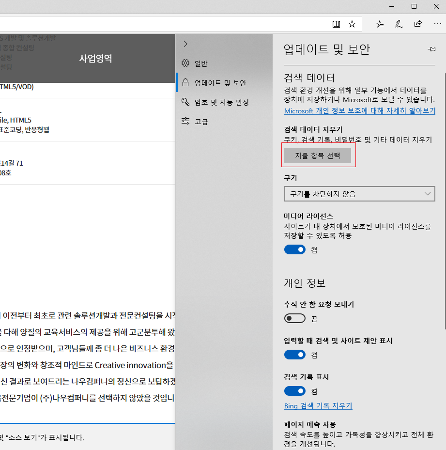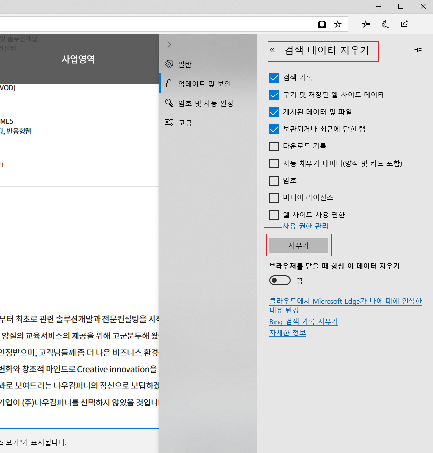 2. 업데이트 및 보안 > (검색 데이터 지우기)지울 항목 선택